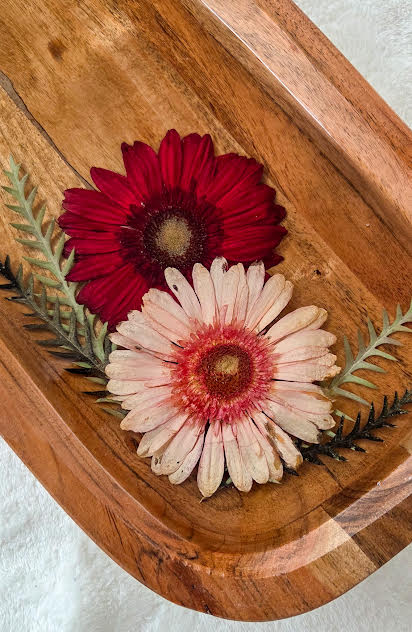 A stunning serving bowl handcrafted with real preserved Gerber daisies set in crystal-clear, food-grade resin. Measuring 16.5" x 8.5", this piece is both functional and eye-catching, making it the perfect statement piece for your next party or gathering. Durable, unique, and designed to impress.