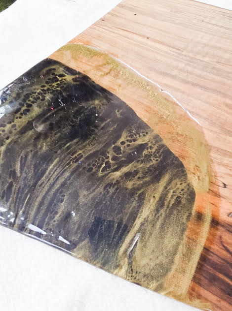 A handcrafted maple serving board featuring sleek black food-grade epoxy with elegant gold lacing details. The tray area measures 14" x 12" (not including the handle) and is finished with butcher block oil for a smooth, durable surface. Perfect for serving or display—simply wipe clean with a damp cloth.